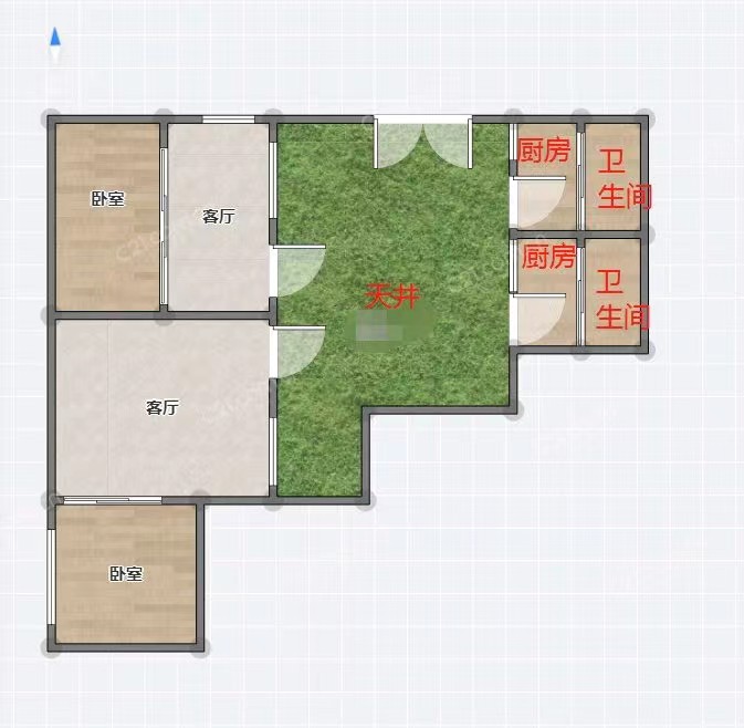 45平米产权面积70平米实际面积 砖结构落地房1楼 两房两厅两卫 分开出租 月租1200 带院子 看到提前预约